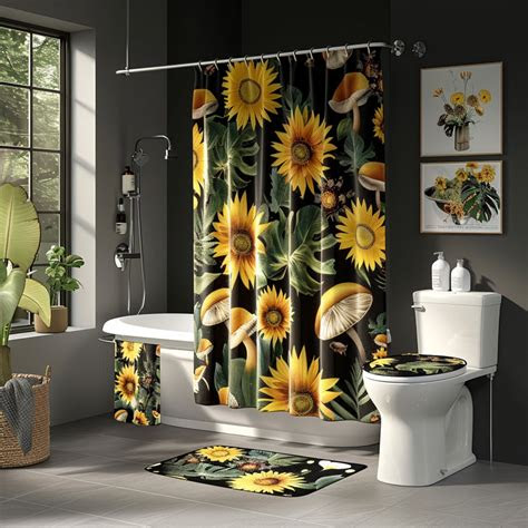 A sunflower bathroom set refers to a collection of bathroom accessories and decor items that feature sunflower motifs or designs. These sets typically include items such as shower curtains, bath mats, towels, soap dispensers, toothbrush holders, and other decorative elements that incorporate the vibrant and cheerful appearance of sunflowers.